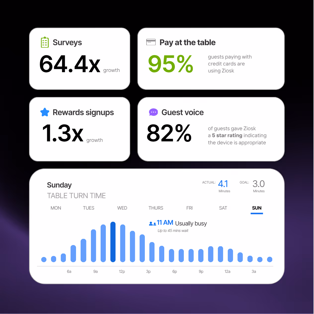 Collect more valuable feedback about your business. Every one in three guests that pay with Ziosk completes a survey, giving you guidance on how to adjust your menu, optimize operations, train staff, and more!